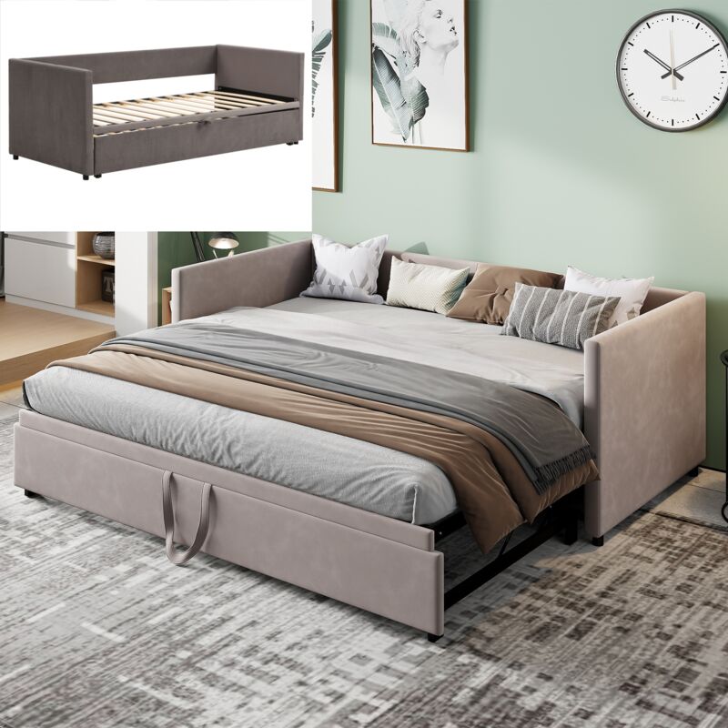 Dans Les Nuages - Lit gigogne capitonné, 90x200 cm/180x200 cm, avec canapé-lit extensible, sommier à lattes en bois, lit double en velours - beige