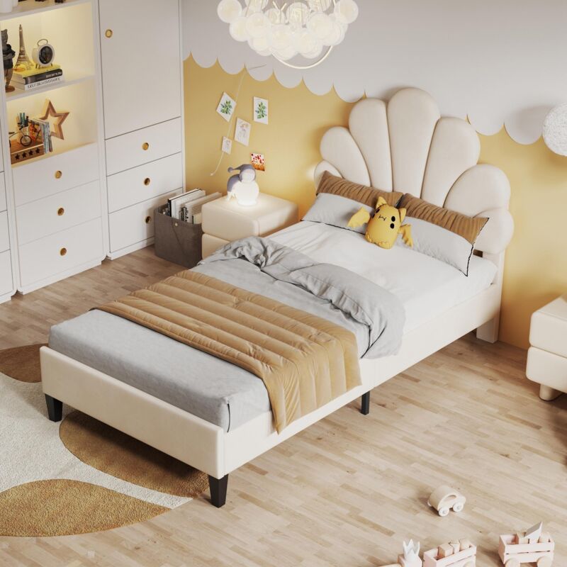 Dans Les Nuages - Lit simple 90x200 cm, tissu velours, avec Tête de lit forme de fleur, sommier à lattes, lit enfant capitonné, style Scandinave