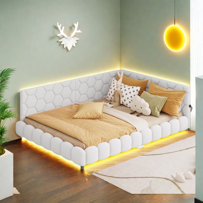 Dans Les Nuages – Lit simple 140x200 cm en velours blanc – Éclairage LED personnalisable – Port USB intégré – Tête de lit rembourrée – Style moderne