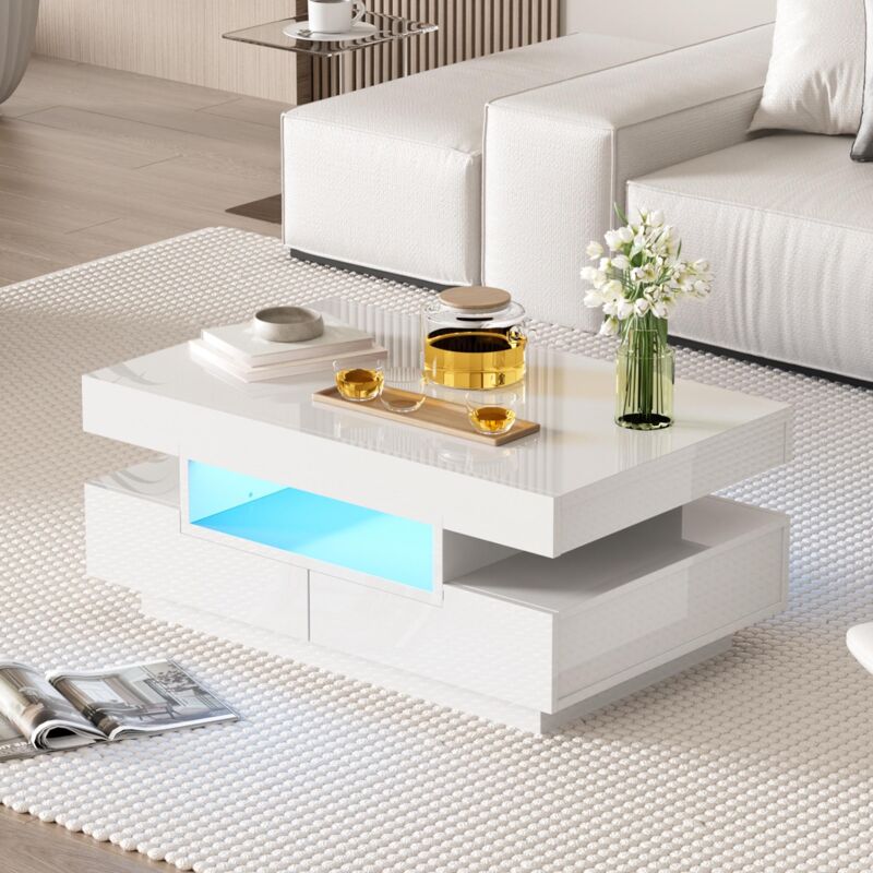 Dans Les Nuages - Table Basse rectangulaire, 80 cm - avec éclairage led, 2 Tiroirs, plateau de table en finition brillante - Blanc