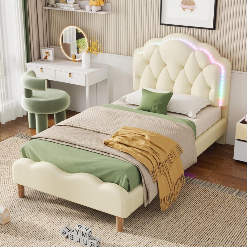 Dans Les Nuages - Lit simple 90x200 cm, tissu similicuir, avec éclairage led multicolores, tête de lit en forme de vagues, sommier à lattes, lit