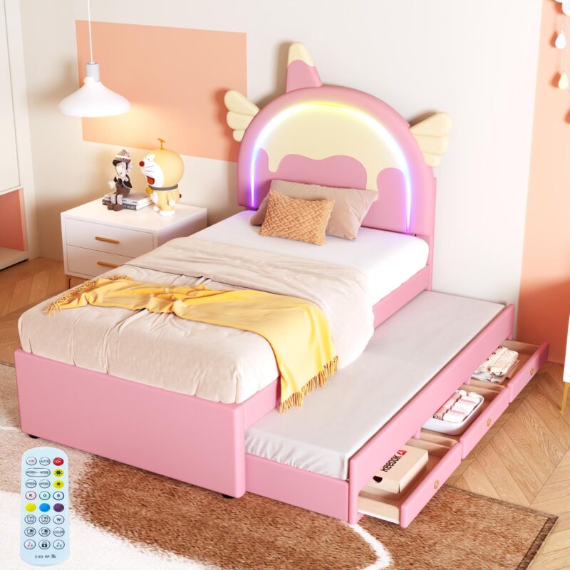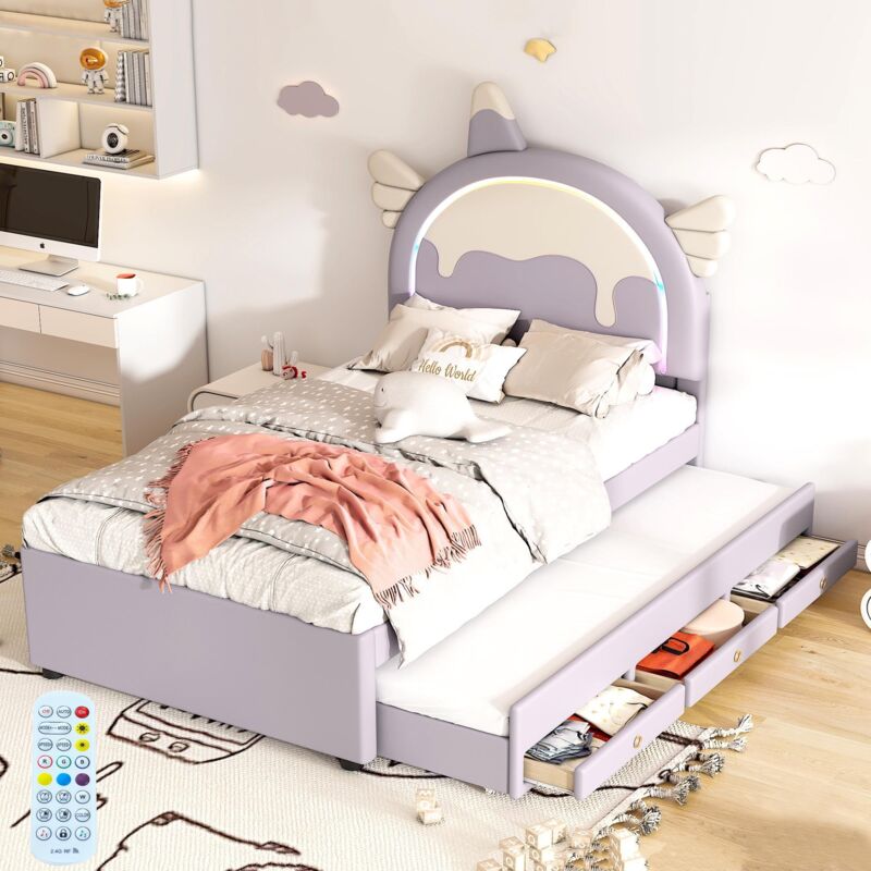Dans Les Nuages - Lit gigogne capitonné 90x200 cm / 90x190 cm, avec Tête de lit en forme de licorne, 3 tiroirs, sommier à lattes, tissu similicuir,