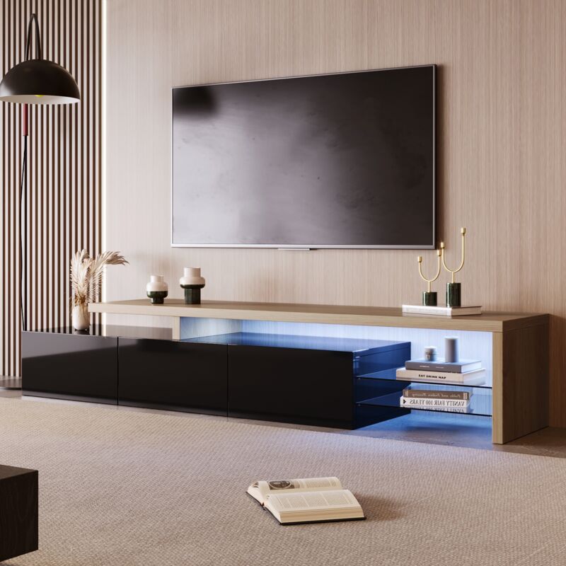 Dans Les Nuages - Meuble tv 200 cm, avec éclairage led, 3 portes, 2 étagères en verre, plateau brillant, style moderne - Noir