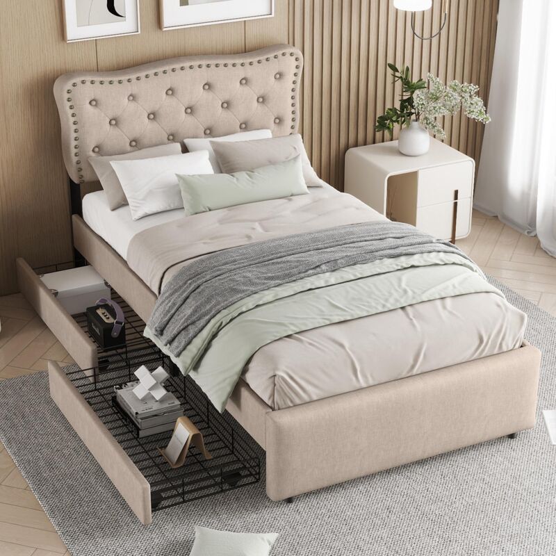 Dans Les Nuages - Lit simple capitonné 90x200 cm, tissu lin avec 2 tiroirs, sommier à lattes, tête de lit avec rivets et boutons, lit enfant style