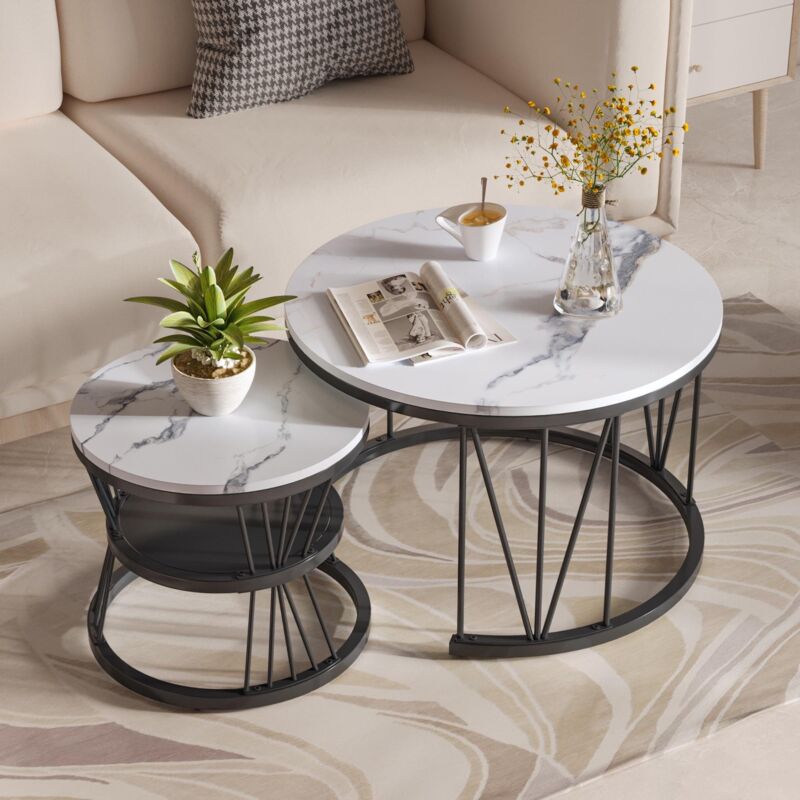 Dans Les Nuages – Lot de 2 tables basses gigognes rondes 70 cm – Plateau en bois effet marbre PVC – Pieds en métal – Design moderne noir