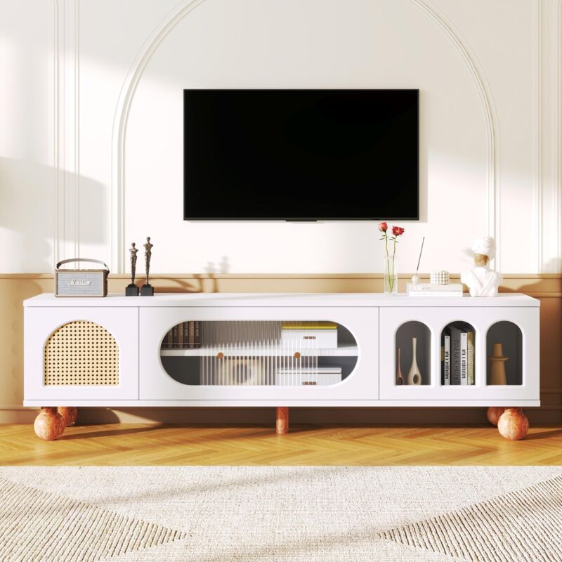 Dans Les Nuages - Meuble tv 170 cm, avec porte en rotin, portes en verre, espace de rangement, style campagne, armoire tv - Blanc