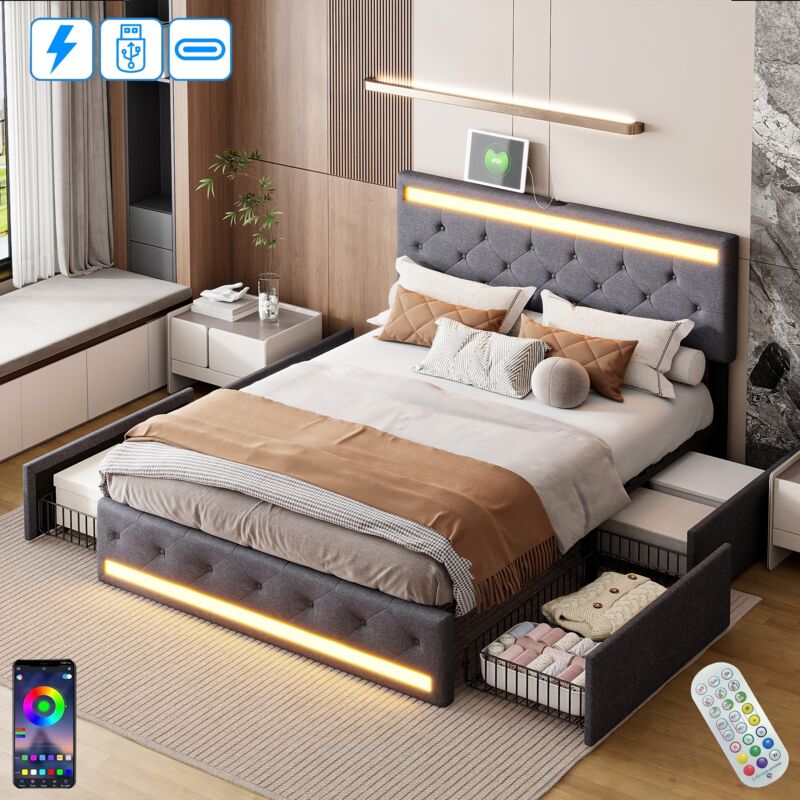 Dans Les Nuages - Lit double capitonné 160x200 cm, tissu lin, avec éclairage led, 4 tiroirs, fonction chargement usb, lit adulte style moderne - gris