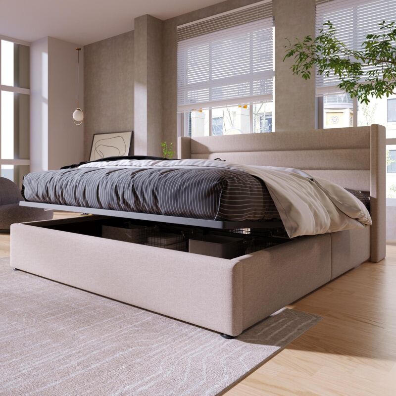 Dans Les Nuages - Lit coffre 160x200 cm, avec hydraulique espace de rangement, sommier à lattes, tissu lin, Style minimaliste, lit double capitonné