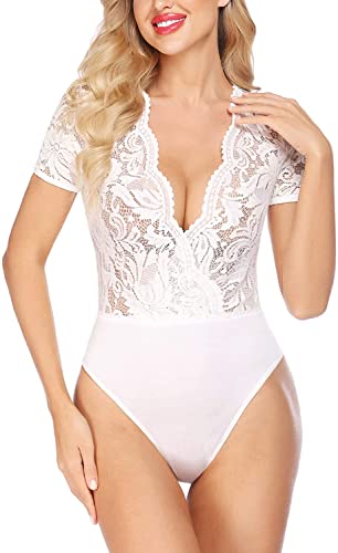 Avidlove Body Dentelle Femme Lingerie Sexy Femme Coquine Hot Manches Courtes Body Femme Top Dentelle Femme Blanc L