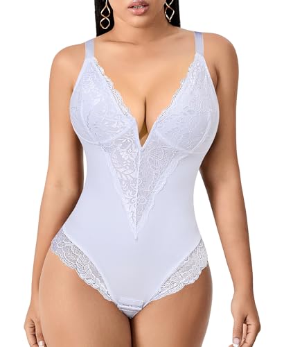 YARRCO Body Gainant Femme Ventre Plat String Gaine Amincissante Body Sculptant Bodysuit Shapewear Col V Dentelle Corset Minceur Lingerie Camisole Top avec Bretelles Réglables (Blanc,M)