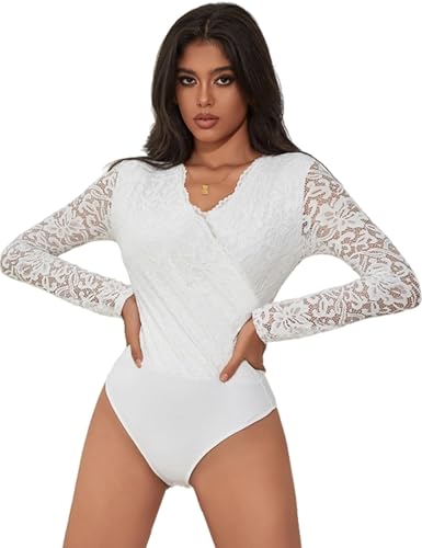 comeondear Sexy Body Manche Longue Femme Bodysuit Chic Dentelle Grande Taille Top Élégant Col V Boutons-pression Lingerie Moulant Leotard Teddy Justaucorps(Blanc,XL)
