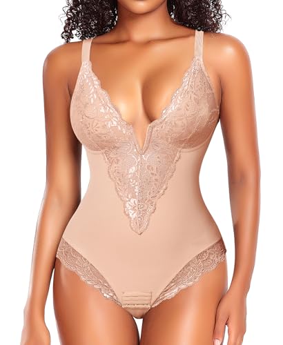 YARRCO Body Gainant Femme Ventre Plat String Gaine Amincissante Body Sculptant Bodysuit Shapewear Col V Dentelle Corset Minceur Lingerie Camisole Top avec Bretelles Réglables (Beige-Lace,L)