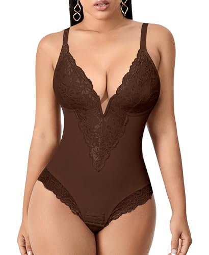 YARRCO Body Gainant Femme Ventre Plat String Gaine Amincissante Body Sculptant Bodysuit Shapewear Col V Dentelle Corset Minceur Lingerie Camisole Top avec Bretelles Réglables (Braun,3XL)