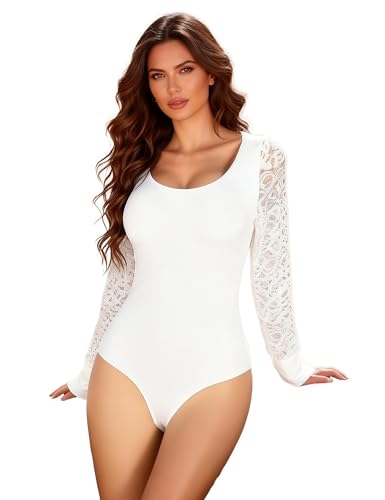 comeondear Body Femme Manches Longues Body Sexy Chic Dentelle Col Rond Bodysuit Stretch Top Ventre Plat Slim Élégante Lingerie Teddy Grande Taille(Blanc,S)