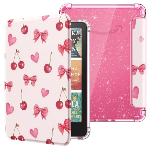 MoKo Étui pour 7" Liseuses 12e Gén 2024/2025, Coque Arrière Ultra Transparente Souple et Flexible en TPU Pailleté avec Auto Réveil/Sommeil, Ne Convient Pas BOOX et Kobo, Nœud Papillon à la Cerise