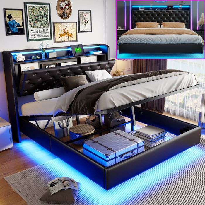 Lit 2 Personnes avec Rangement – Lit 140x200 avec Sommier – Hydraulique – LED – 1 USB + 1 Type-C – Lit Flottant – Similicuir – Noir