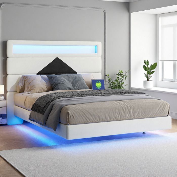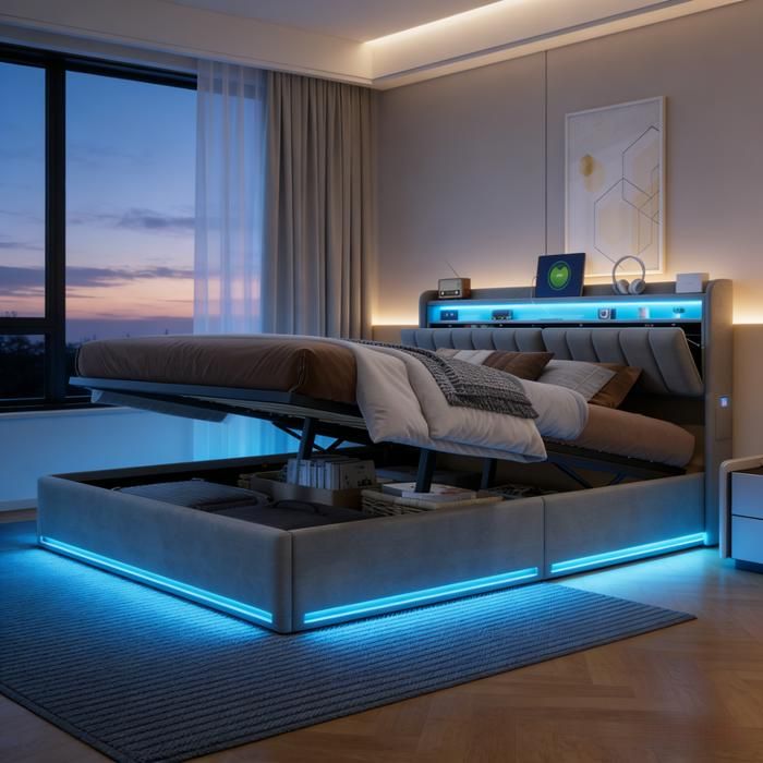 Lit 140x190 cm en velours avec rangement hydraulique, tiroir, sommier à lattes et led beige chicfurn