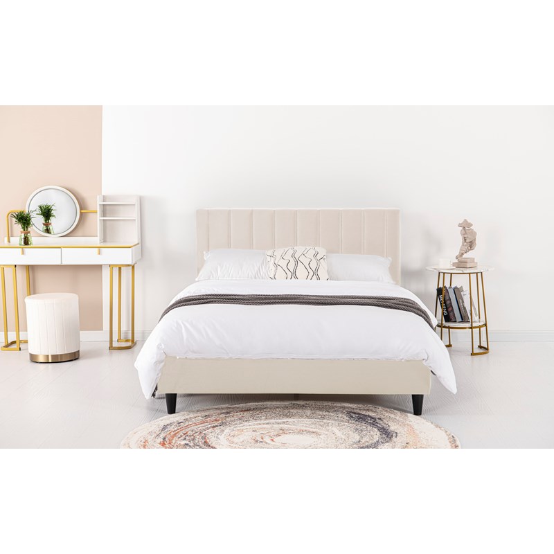Lit rembourré 140x190 cm velours beige, sommier lattes + tête de lit – idéal chambre jeune ou simple
