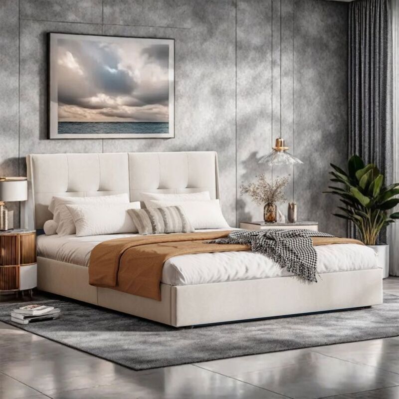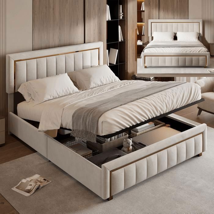 Lit coffre 160x200 cm - SUNFECILI - Velours beige - Lampe à capteur - Design contemporain - 2 places