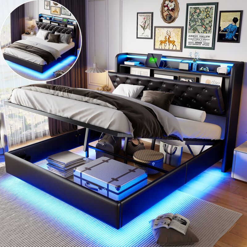Lit coffre 160x200 - SUNFECILI - Velours gris - LED intégrée - Capacité 300 kg - Design contemporain