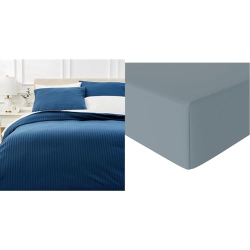 Amazon Basics 3 pièces Parure de lit avec Housse de Couette Haut de Gamme avec Deux taies d'oreiller, 240 x 220 cm, Bleu Marine, Uni & Drap-Housse en Microfibre Bleu Spa 160 x 200 x 30 cm