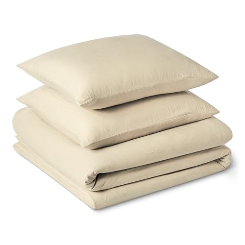 Amazon Basics Parure de Lit 2 Personnes 3 Pièces en Microfibre Prélavée, Extra Douce avec Effet Froissé Naturel, sans Repassage, Housse de Couette 240 x 220 cm et 2 Taies d'oreiller 65 x 65 cm, Beige