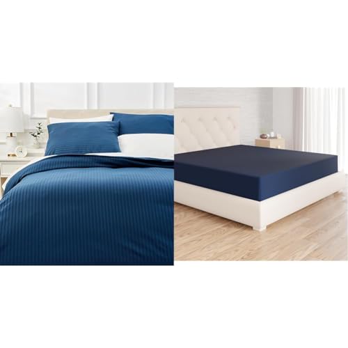 Amazon Basics 3 Pièce Parure de lit avec Housse de Couette Haut de Gamme avec Deux taies d'oreiller, 260 x 240 cm, Bleu Marine, Uni & Drap-Housse en Microfibre Bleu Marine 180 x 200 x 30 cm
