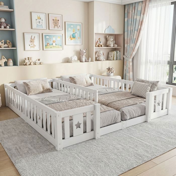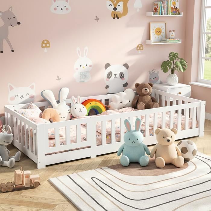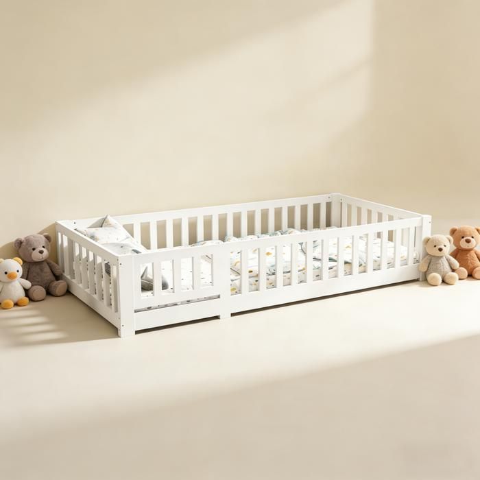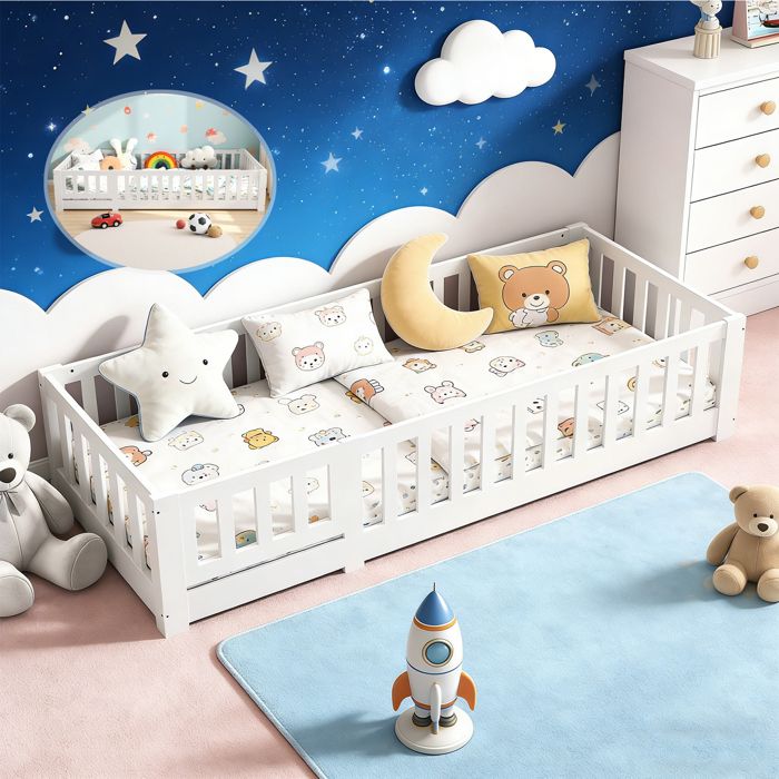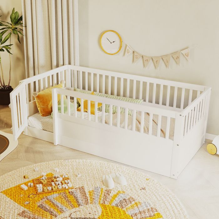 Lit enfant au sol 90x200 cm avec rangements intégrés, barrières de sécurité et porte, blanc chicfurn