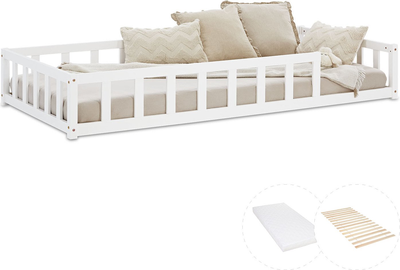 Lit D'Enfant 90x200 cm Lit Montessori avec Barriere en Bois Blanc Lit au Sol Bebe Lit Bas Lit Simple