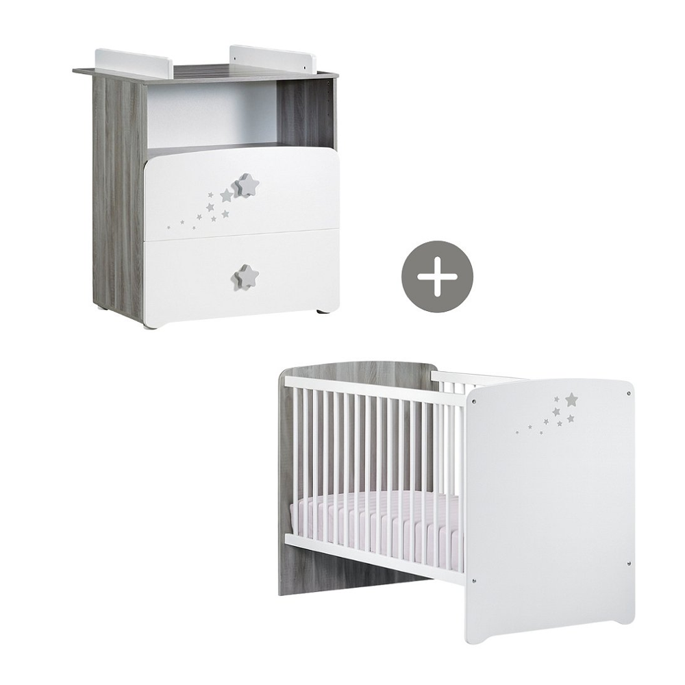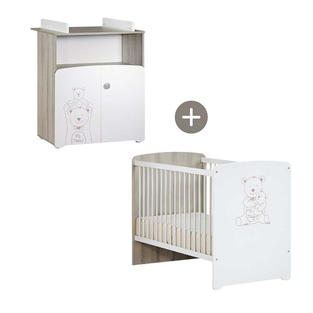 Chambre bébé 4 pièces lit commode plan à langer et armoire 3 portes bois laqué blanc et pin clair...