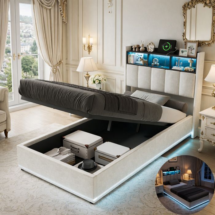 MODFU Lit Double 140x200 cm - Lit Capitonné Beige avec 4 Tiroirs de Rangement et LED, Matelas Inclus