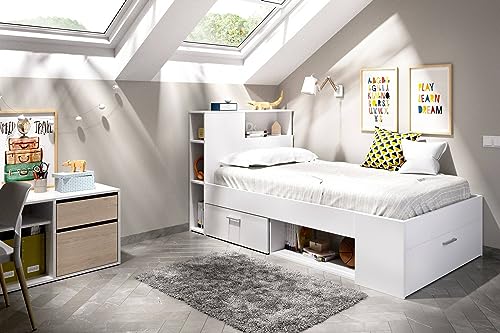 Dmora - Lit Simple Blanc, Cadre de Lit avec Tiroir et Étagères, Tête de Lit avec Bibliothèque, 218x99h96 cm