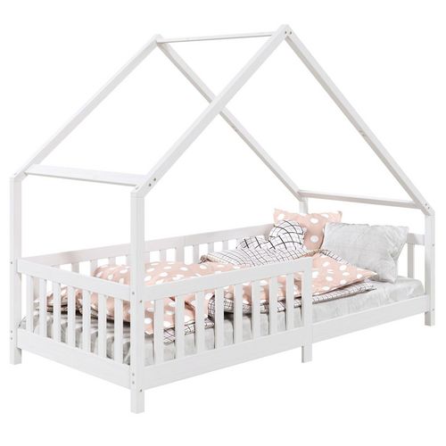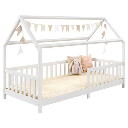 roba Lit cabane 90 x 200 cm - Lit pour enfants selon le principe Montessori - Extensible avec sommier à lattes et housse de lit cabane - Barrière de protection intégrée - Bois laqué blanc