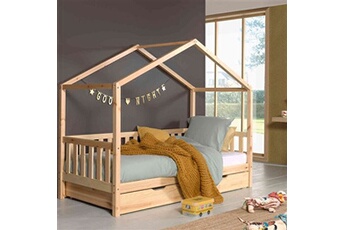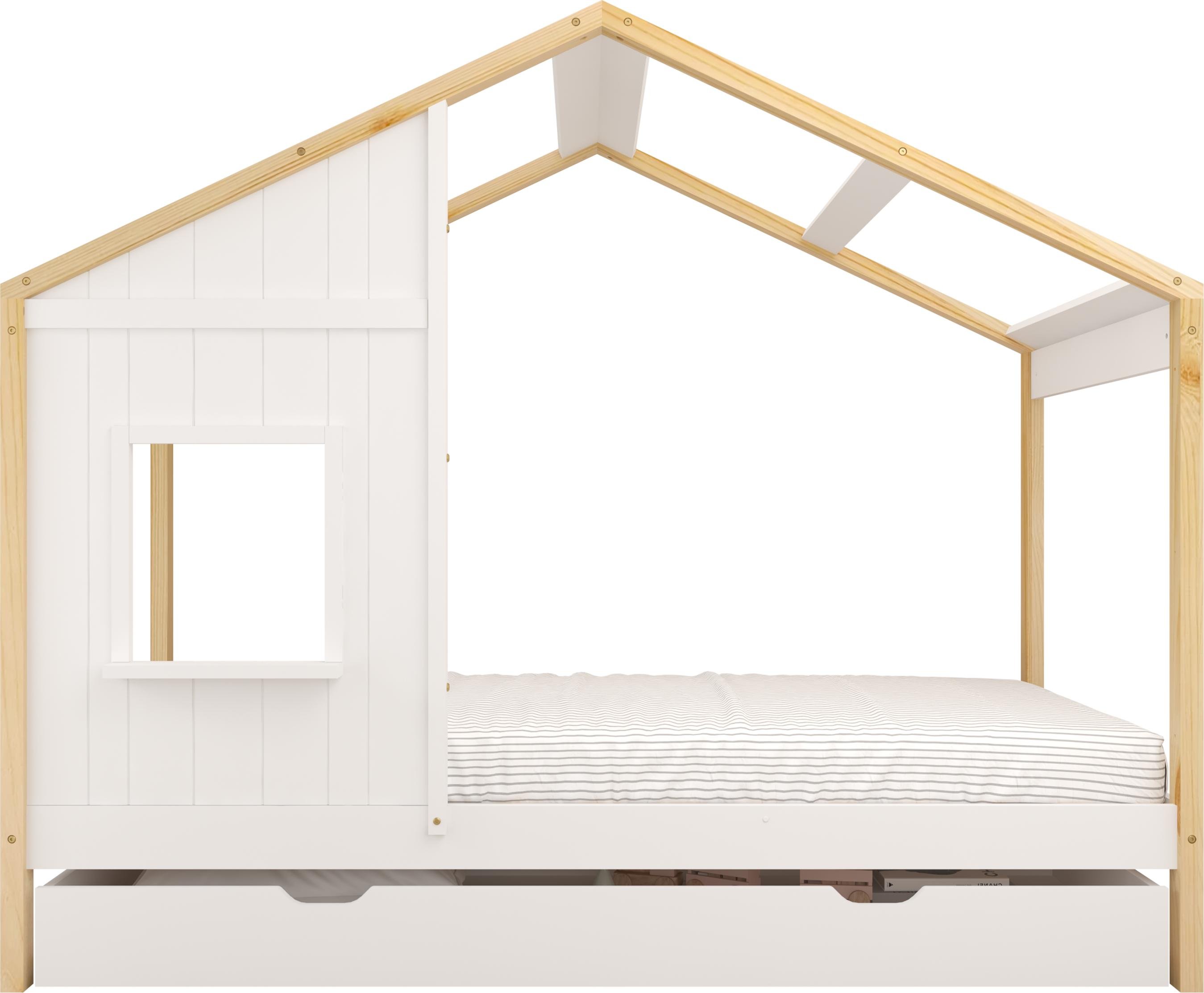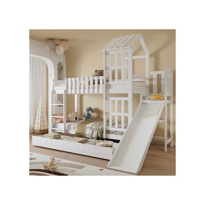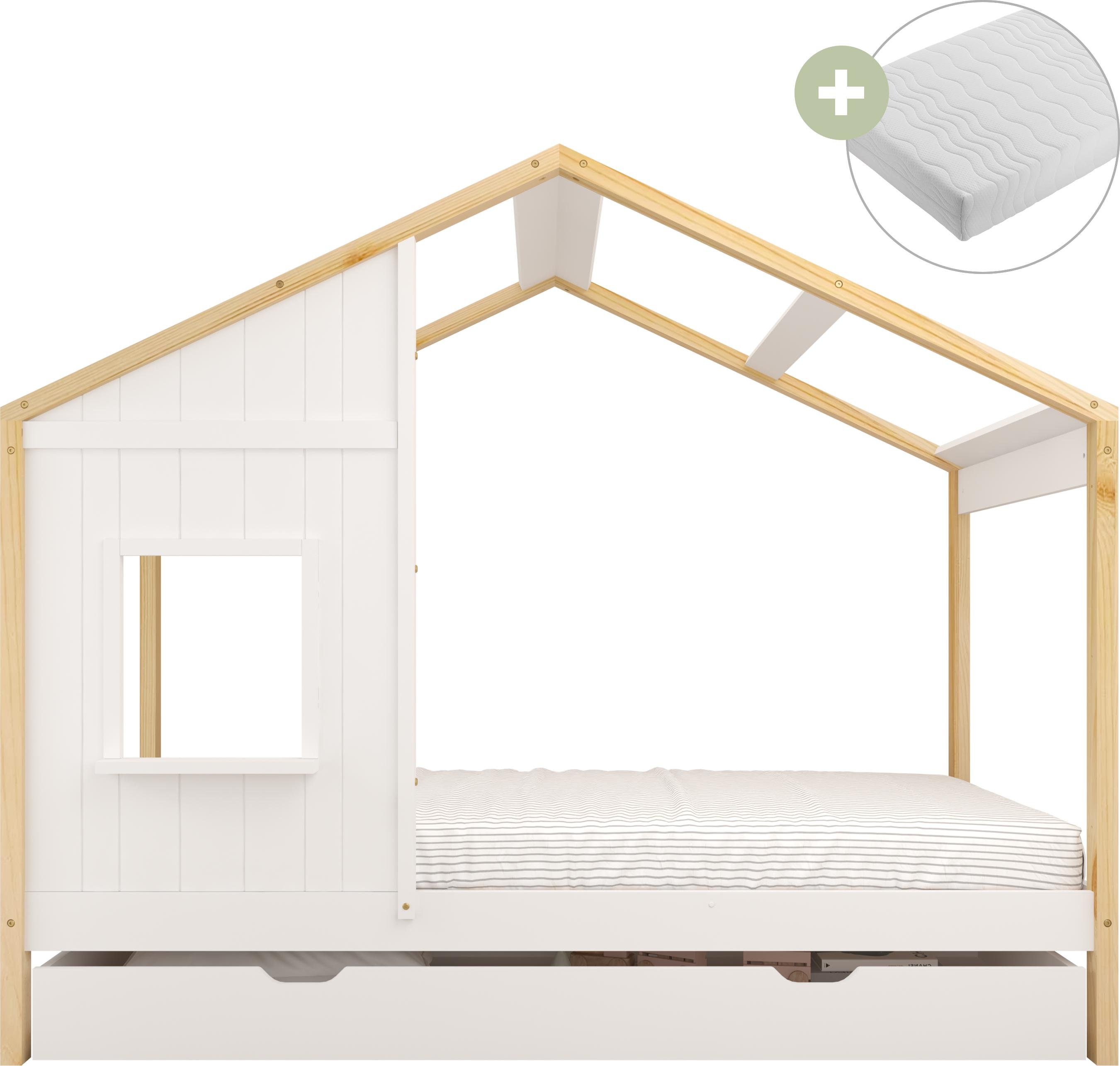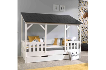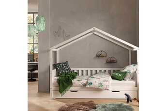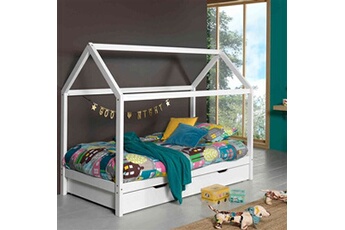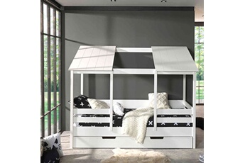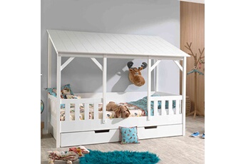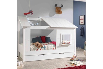 Lit cabane mi-hauteur enfant 90x200 blanc en pin massif avec tiroir sommier et barrières de sécurité