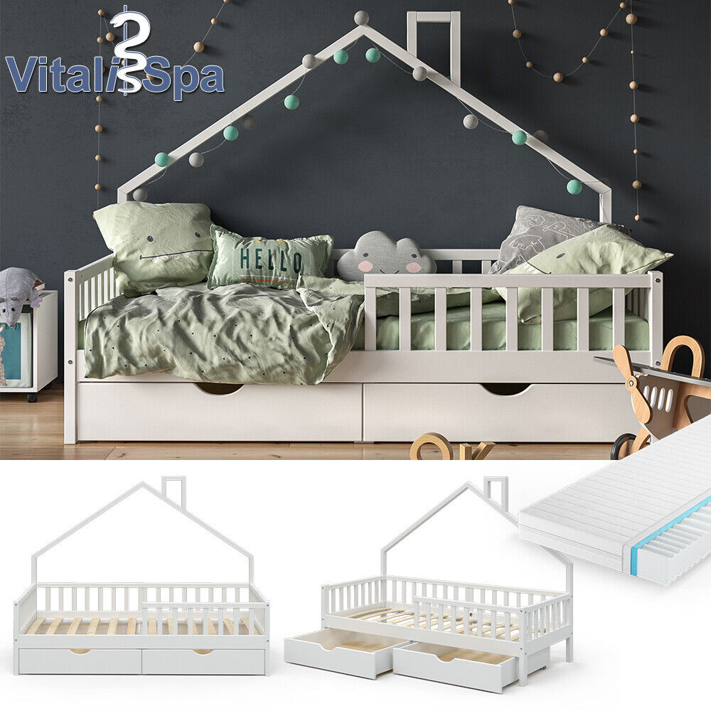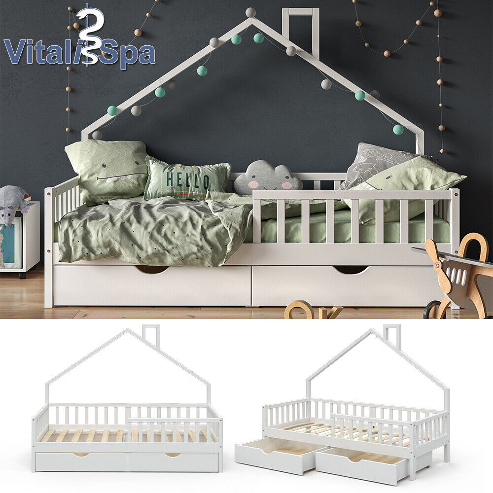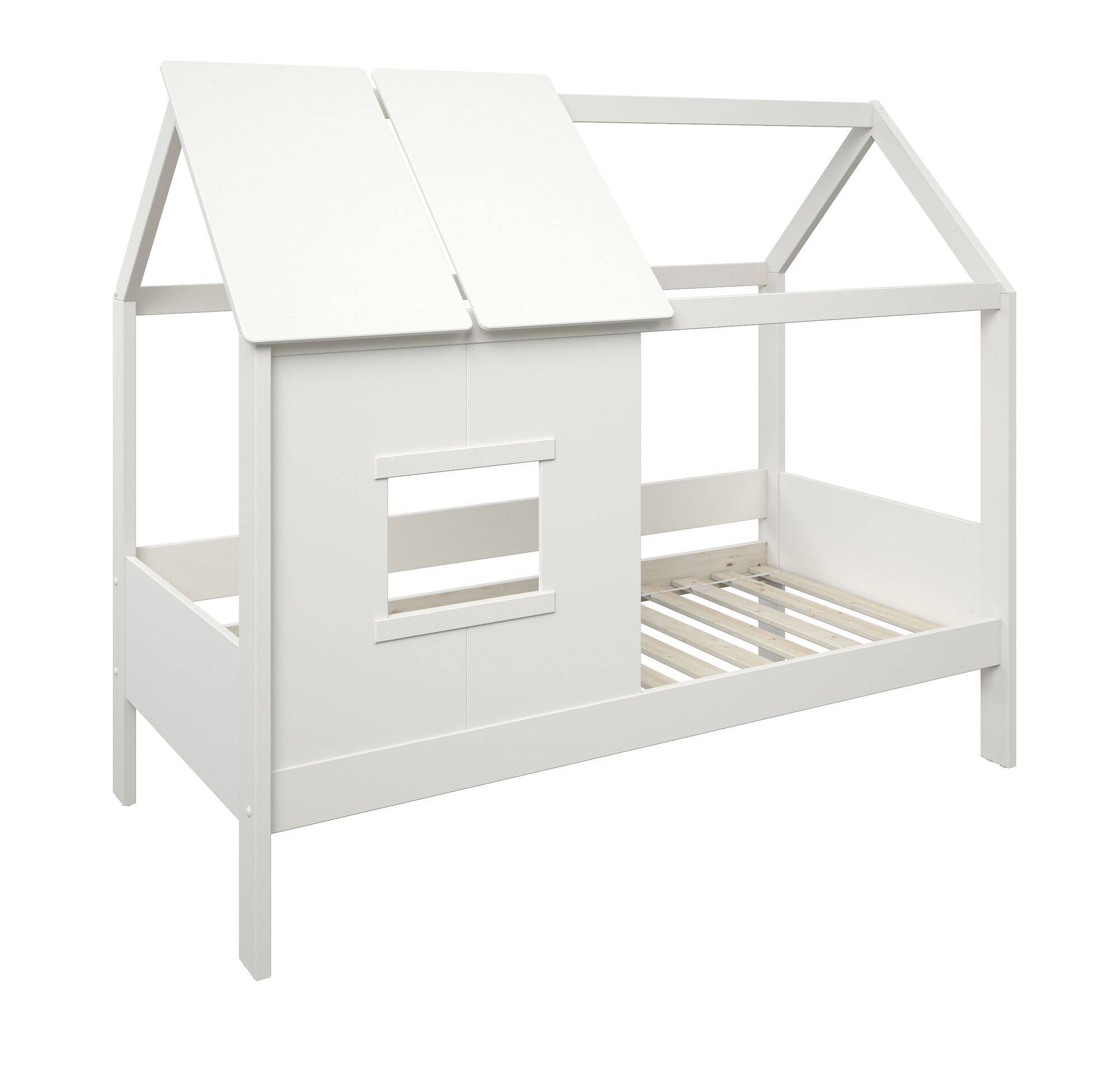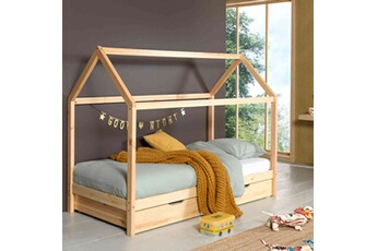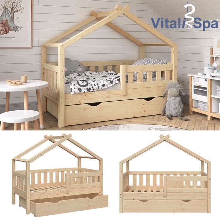 Lit cabane mi-hauteur enfant 90x200 blanc en pin massif avec tiroir sommier et barrières de sécurité