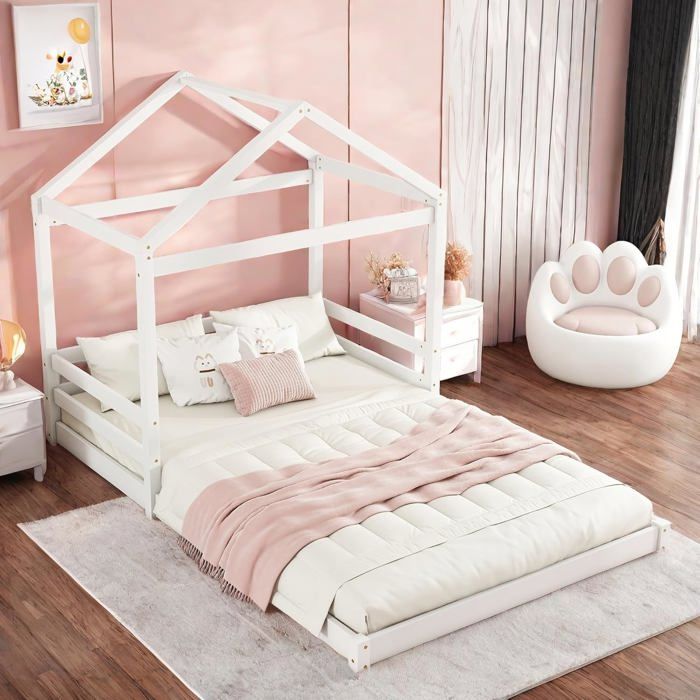 Lit Cabane 140x200 Deux Places - Lit Cabane Enfant de Sol avec Sommier - Cadre de Lit Montessori Métal - pour Fille Garcon - Blanc