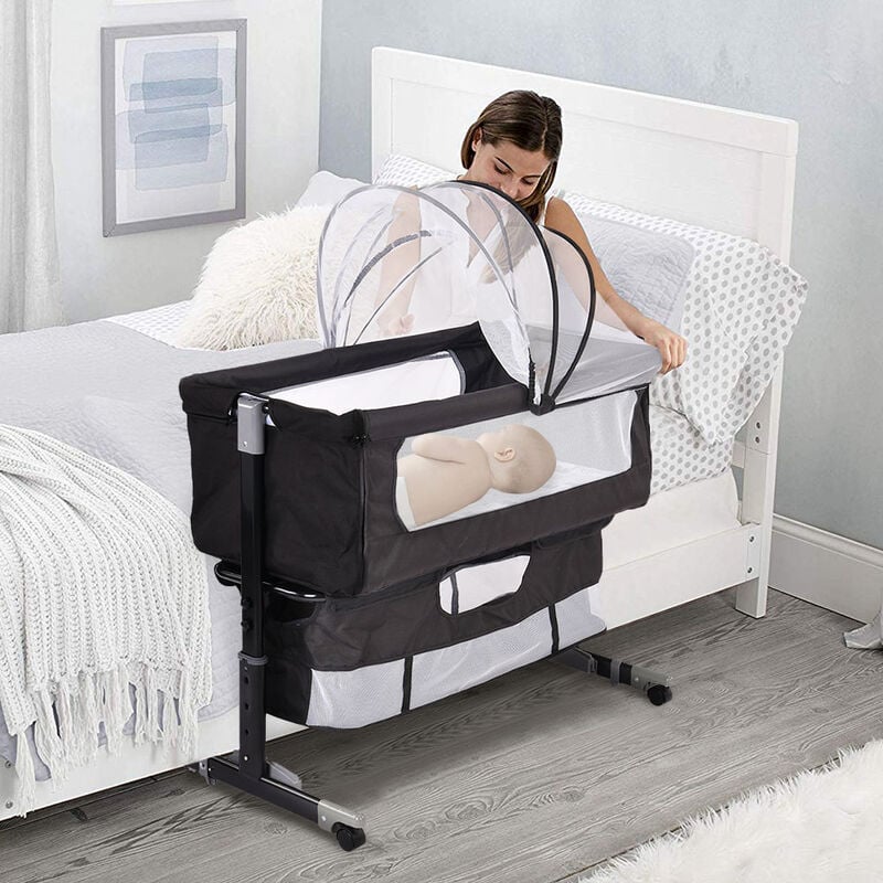 Lit Bébé Berceau Cododo, Lit Cododo Bebe Pliable, Côté Repliable, Hauteur Réglable, Fenêtre en Filet, Panier de Rangement Roues - Noir
