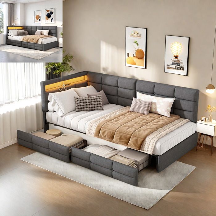 Lit rembourré 90x190 cm méridienne avec coffre 2 tiroirs et port USB‑C lin gris 1 place sans matelas