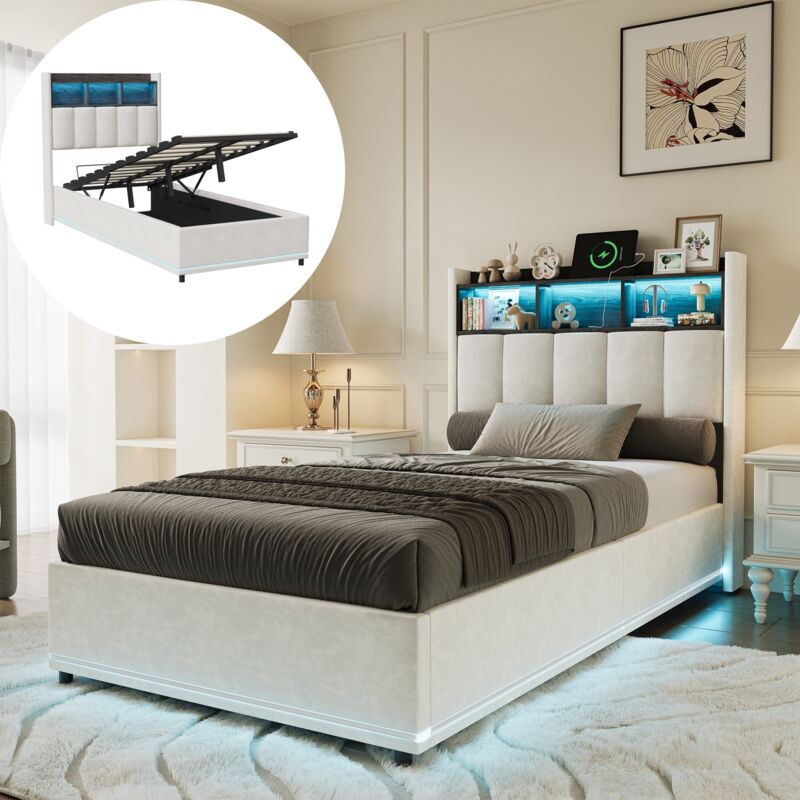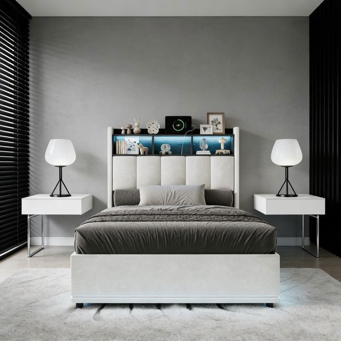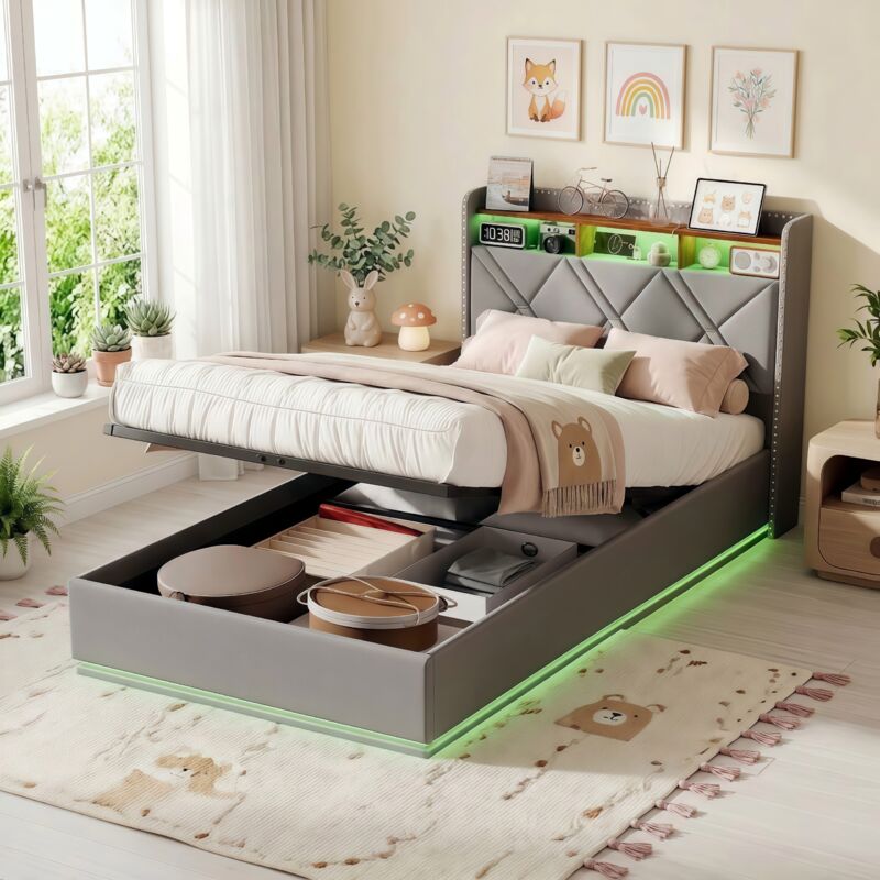 Lit simple 90x200 cm avec lit coffre 1 place, 4 tiroirs et éclairage led - ports usb intégrés - gris