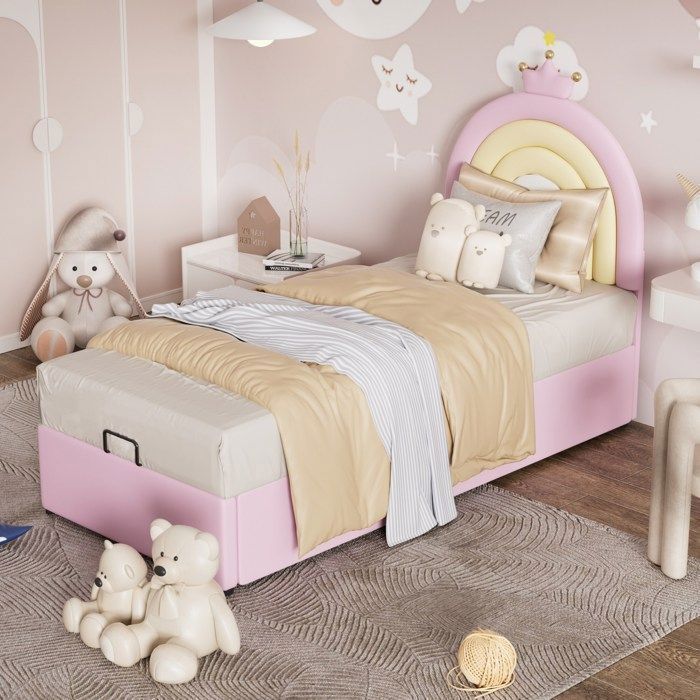 Lit enfant 90x200cm, lit coffre, lit 1 place avec tête de lit et sommier, velours rose, sans matelas