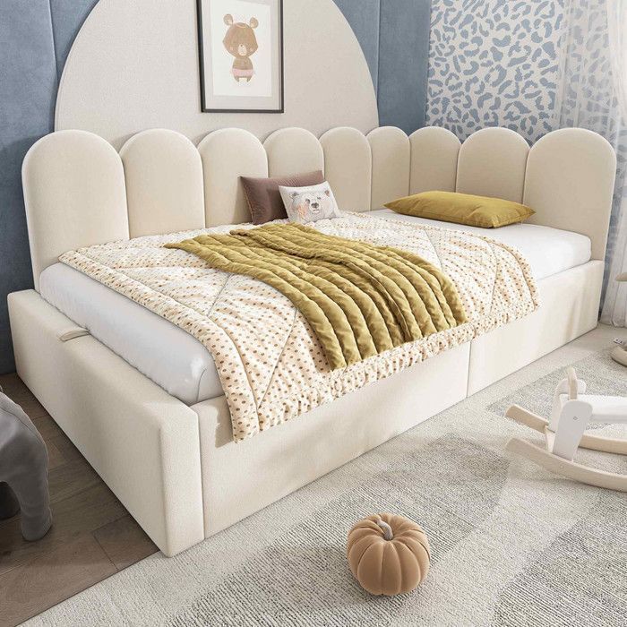 Canapé-lit 90x190 cm - LEYTN - Velours beige - Lit coffre hydraulique - Rangement pratique - 1 place