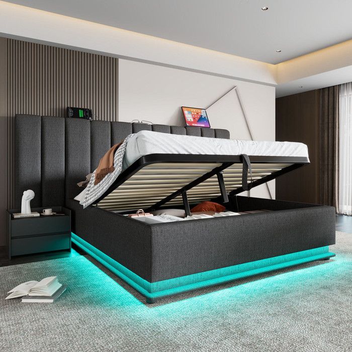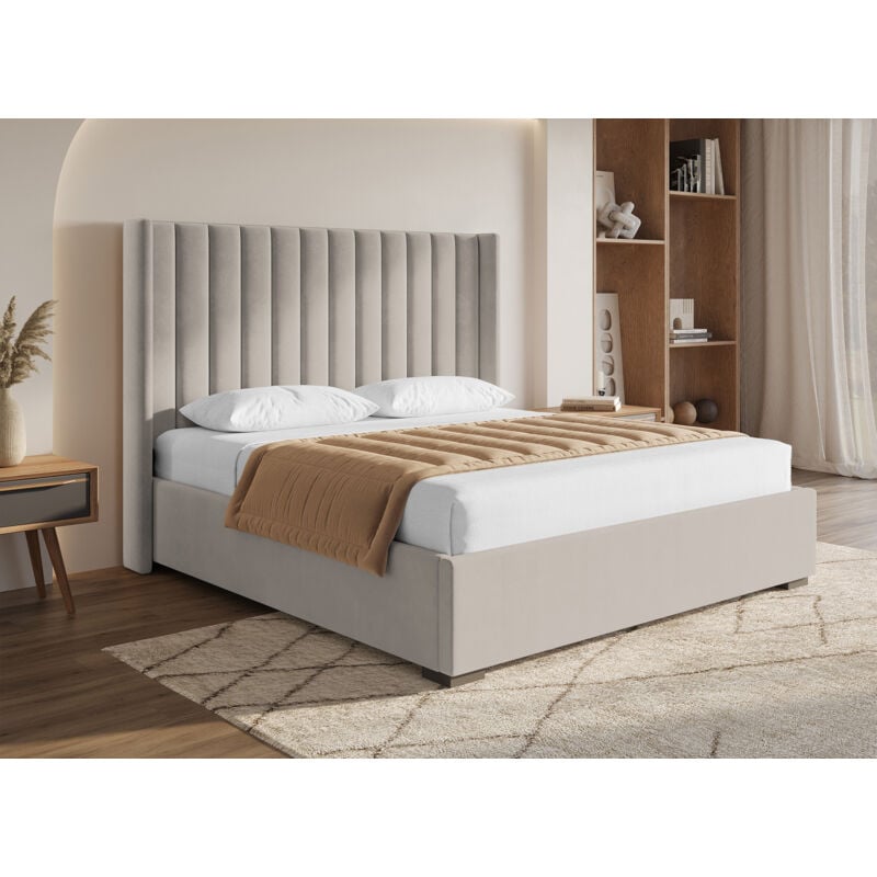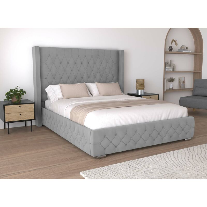 Lit coffre en velours 180x200 cm - 2 chevets + 2 liseuses avec prise usb - gris (matelas non inclus)