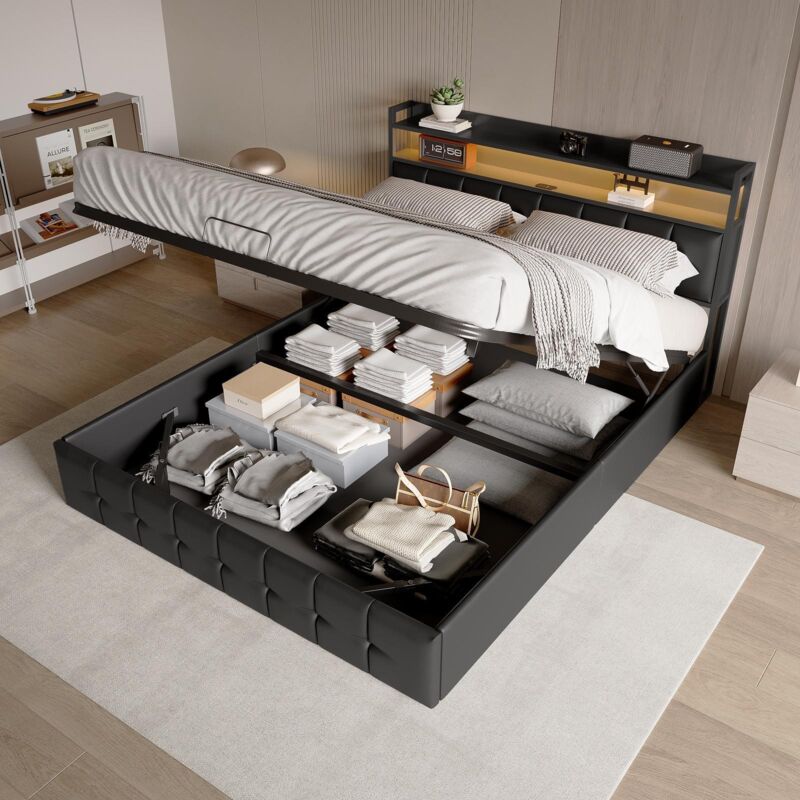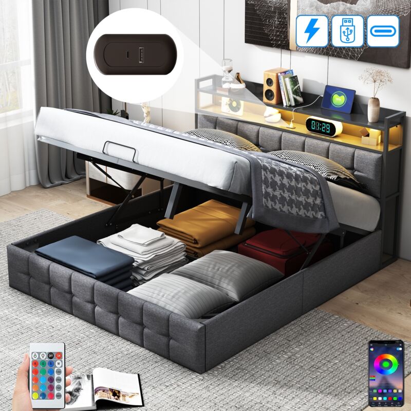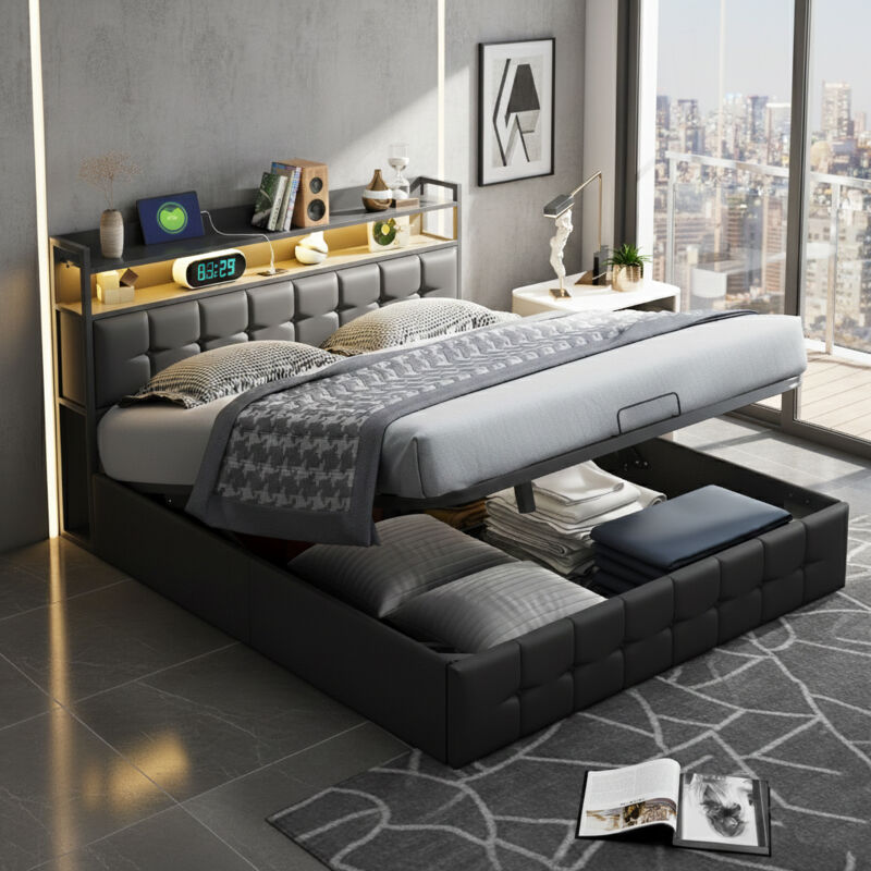 Lit coffre 140x190 cm, 2 places, avec têtes de lit LED, USB, étagères, hydraulique de rangement, sommier à lattes en bois, cadre en métal, lit