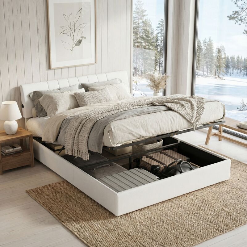 Lit Coffre 140x190 cm en Bois Blanc avec Étagères Hydraulique USB Type-C Sommier Inclus