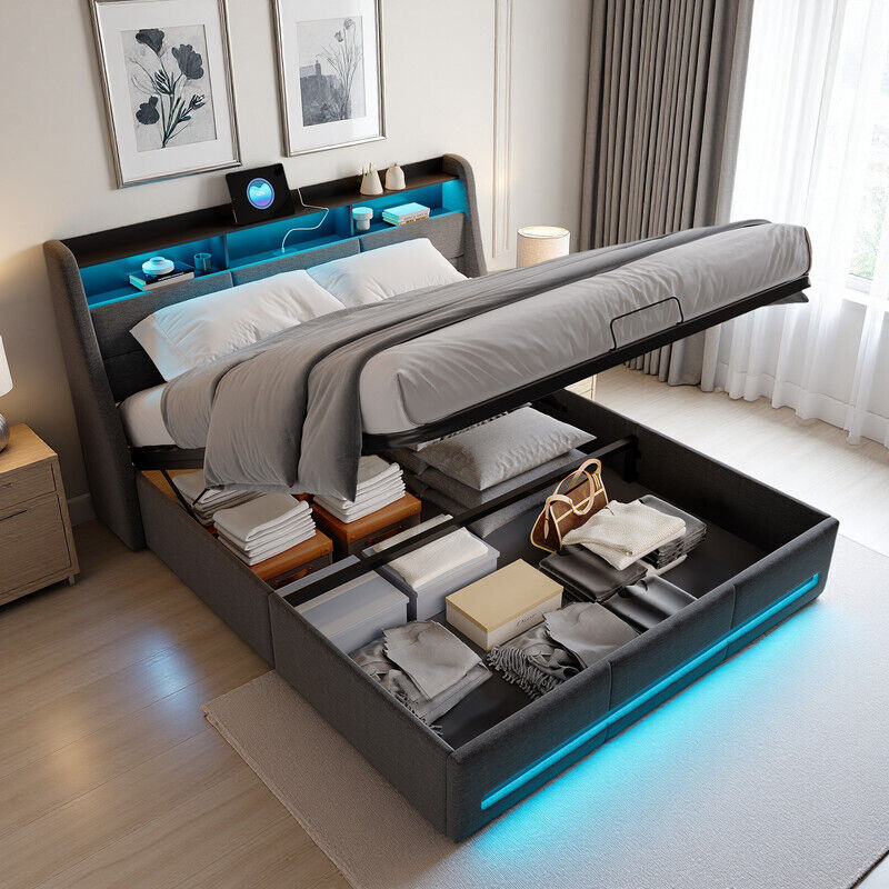 Lit double 140x190 cm avec 4 tiroirs de rangement, Tête de lit coffre avec USB et port LED – Sommier à lattes en bois – Cadre métal lin Gris