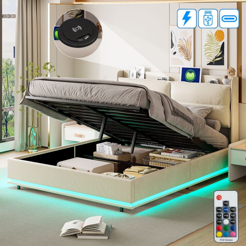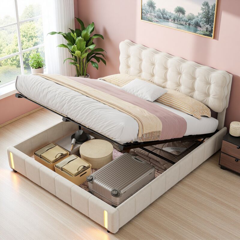 Tanant – Lit coffre 140x190 cm avec éclairage LED – Rangement hydraulique – Tête de lit en velours beige – Sommier à lattes en bois massif