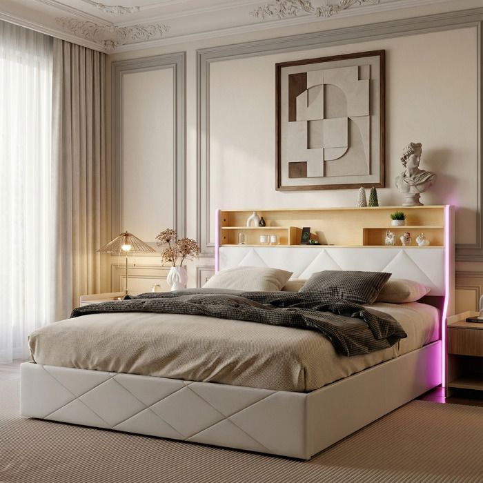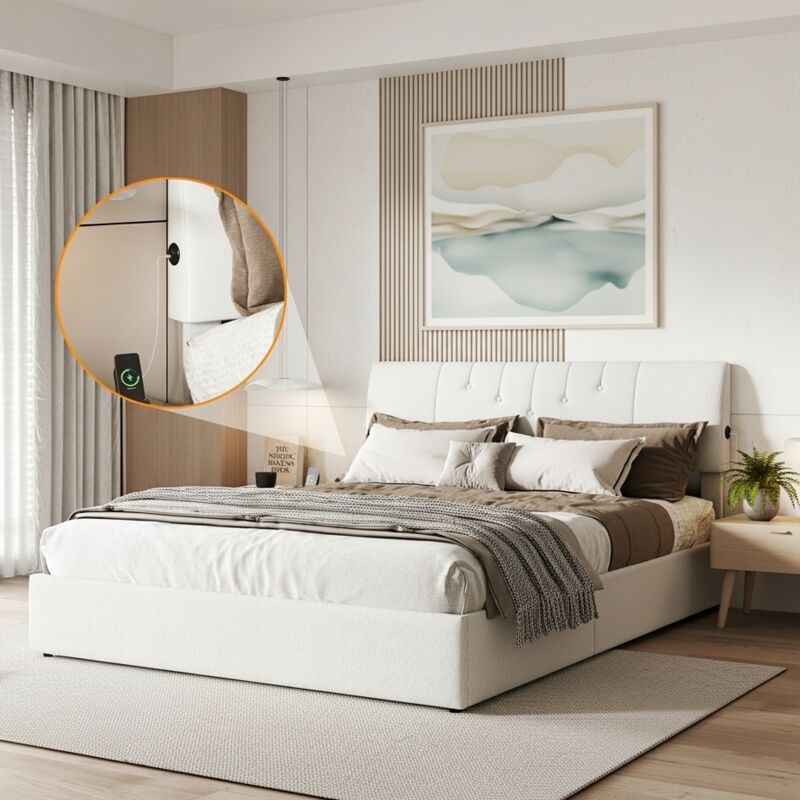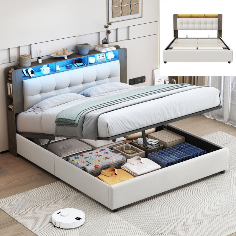 Lit coffre 140x190 - AAK - Lin blanc - Tête de lit avec Led et Usb - Cadre de Lit avec Sommier à Lattes en Bois - 2 places