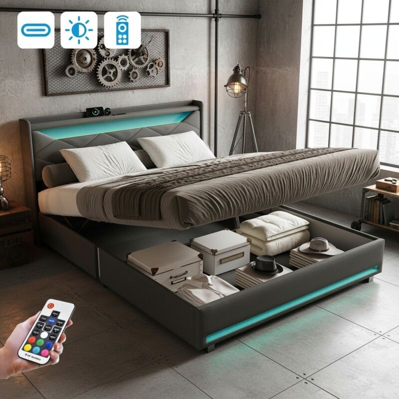Lit coffre 140x190 cm, avec éclairages led, hydraulique de rangement, tête de lit de rangement, usb-a/c charge, sommier à lattes en bois, lit