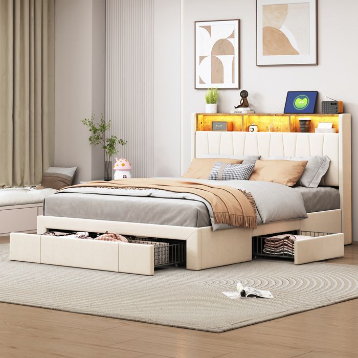 Lit rembourré - KILISKY - 160x200 cm - Lit coffre - Lumineuse LED - avec Ports USB & 4 Tiroirs – Espace de Rangement - beige