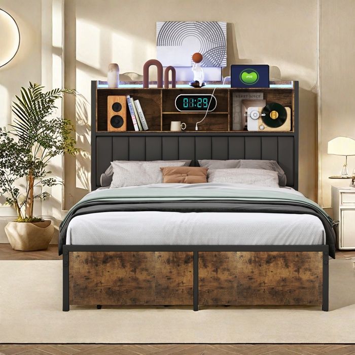 lit coffre led avec station de recharge et espace de rangement cadre de lit avec sommier à lattes design industriel 160 x 200 cm